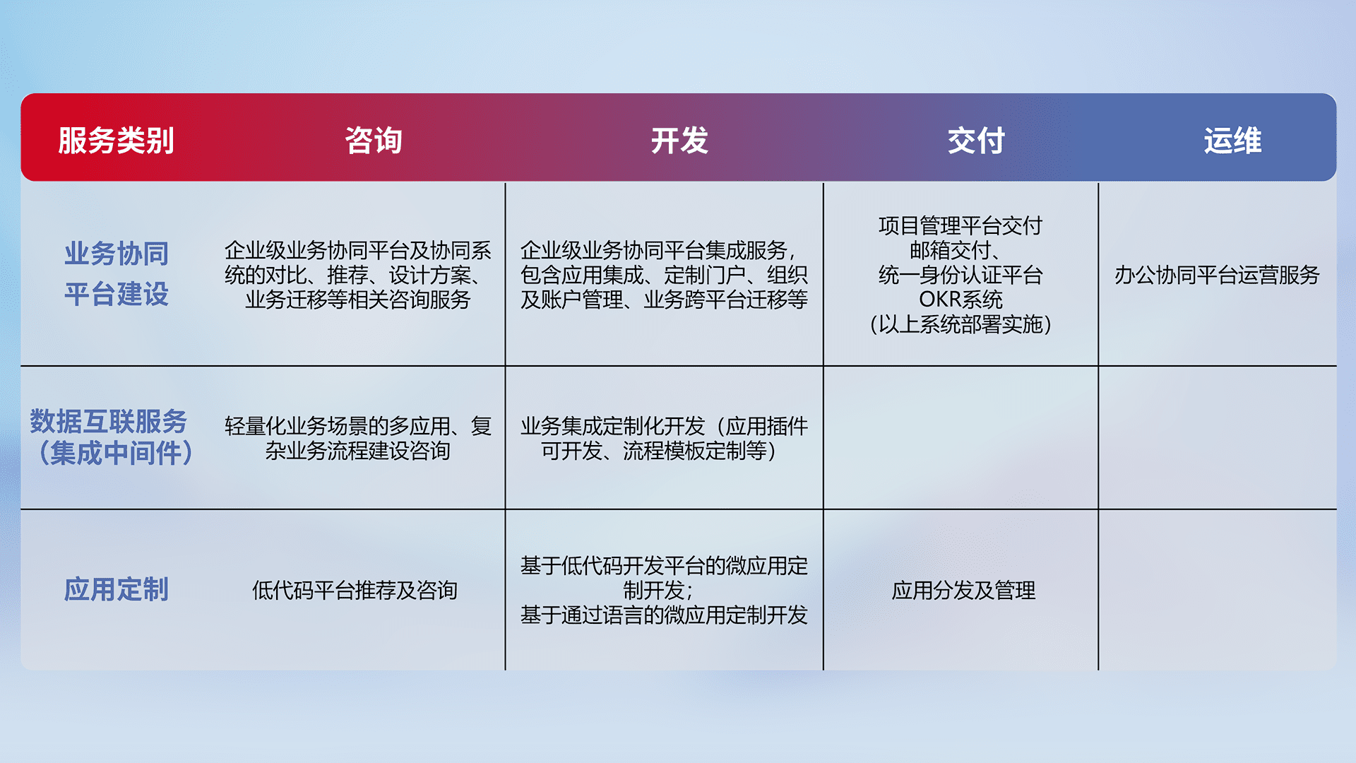 针对钉钉、、企微、、IDaas等平台级产品提供产品的规划、、方案、、交付、、、、定制化开发等服务,,实现如统一协同办公、、智能客户服务、、、、混合会议管理、、、、智能数据查询、、等业务场景,,实现数字化转型。。。。